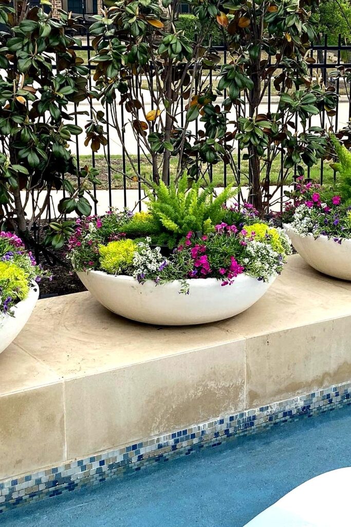Low, white bowl planters bursting with vibrant flowers and textured greenery create a chic and contemporary look perfect for poolside lounging.
